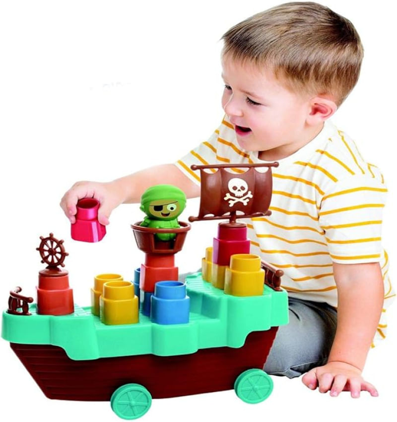 Fofo Blocos Barco Pirata é um Kit completo para brincar! Um lindo barco com rodas livres, boneco pirata, blocos e peças fofinhas. A brincadeira é encaixar, empilhar e montar as peças no barco e levar o pirata para passear. blocos e peças seguras adequadas para crianças pequenas. Material atóxico.