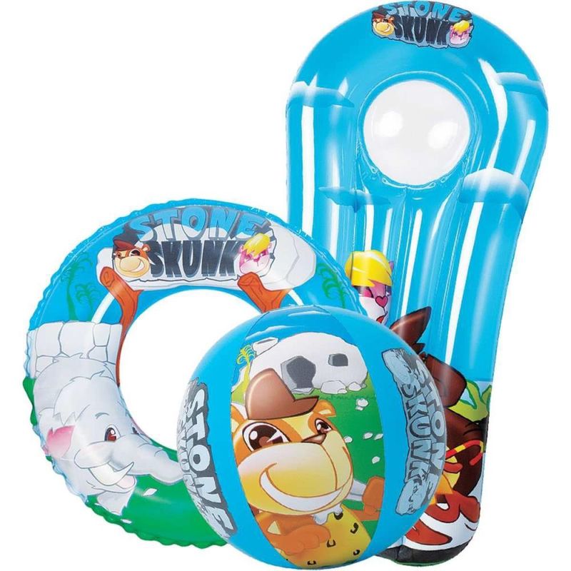 Kit completo para um dia inteiro de diversão! – Bola: 40 cm. – Boia: 55 cm. – Colchão: 115 cm (L) x 60 cm (A). Acompanha uma bolsa de PVC. Idade Mínima Recomendada: 3 a 6 anos.