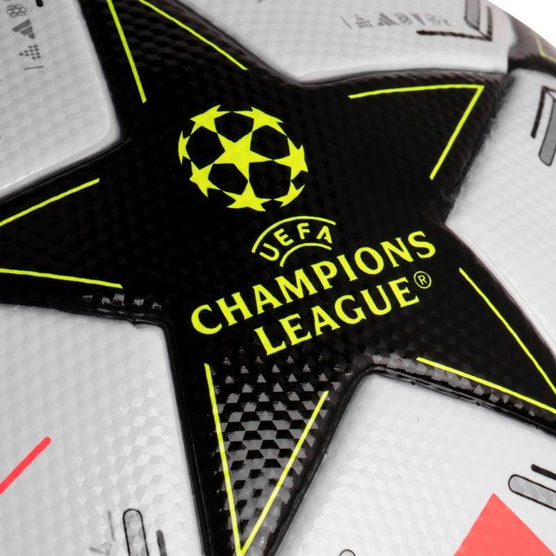 Inspirada na UEFA Champions League, combina estilo e desempenho em um design marcante. Seu fundo branco é realçado por estrelas pretas com detalhes metálicos prateados e toques vibrantes de amarelo neon, transmitindo energia e modernidade sem perder a sofisticação característica da competição. Com construção de alta qualidade, oferece durabilidade e bom desempenho, sendo ideal para jogos e treinos.