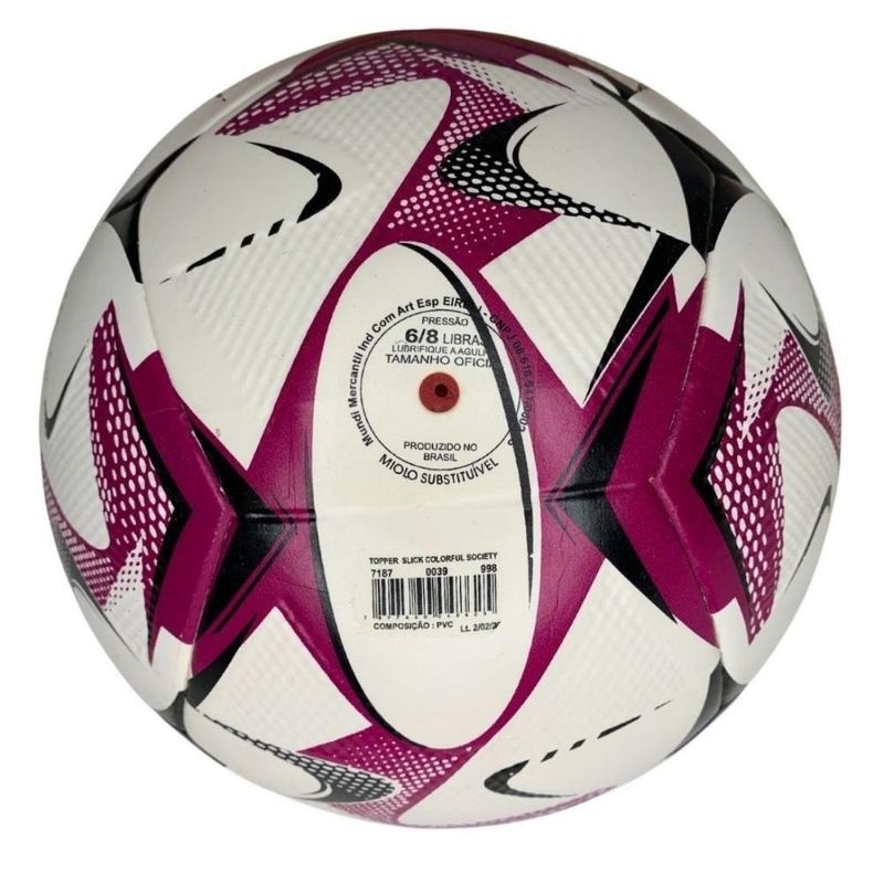 Bola Campo Topper Slick Colorful Roxa - TopperA Bola Campo Topper Slick Colorful é fundamental para seus jogos em campos de grama natural. Esta bola foi desenvolvida com 6 gomos em PVC que possuem uma textura especial que aumenta o atrito da bola tanto nas chuteiras, quantos nas luvas. Ela traz a tecnologia Termofusion eliminando as costuras, que faz com que a bola se torne mais esférica e também diminui a absorção de água, aumentando sua durabiliadade. Com o miolo lubrificado e removível, ela ainda possui uma câmara Airvility que possui sistema de balanceamento, com ótima resistência à retenção de ar. Medidas aproximadas: 68cm (podendo variar de acordo com a calibragem). DESCRIÇÃO Referência: 71860039. Tipo: Campo. Material: PVC. Câmara: Airvility. Circunferência: 68cm (podendo variar de acordo com a calibragem). Gomos: 6. Indicado: Jogo e Treino. TECNOLOGIAS Airvility: câmara com sistema de balanceamento, com ótima resistência à retenção de ar. Termofu