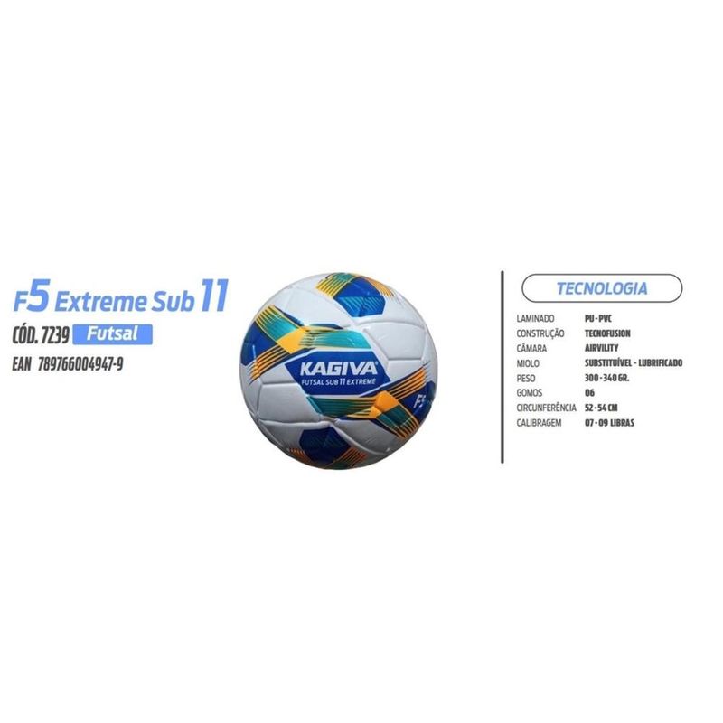 Indicada para crianças de aproximadamente 11 anos. A Bola Futsal Kagiva F5 Sub 11 Extreme tem um excelente custo benefício, com tamanho e peso oficiais para a categoria sub 11, sem costura, fazendo com que a bola fique mais resistente, mais macia e impermeável, mesmo quando molhada mantém seu peso e tamanho com 0% de absorção de água. Perfeita para suas Partidas. Características: - Laminado: Pu - Pvc - Construção: Tecnofusion - Câmara: Airvility - Miolo: Substituível - Lubrificado - Peso: 300 - 340 gr - Gomos: 6 - Circunferência: 52 - 54 Cm - Calibragem: 07-09 Libras