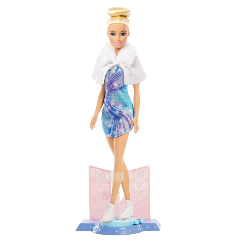 Esta boneca Barbie está pronta para entrar no gelo e arrasar em sua apresentação de patinação! Ela veste um figurino brilhante em tons de azul e roxo, com patins brancos, além de um bolero branco felpudo para se aquecer após a performance. As crianças podem recriar os movimentos de patinação com a base que gira de verdade, além de acessórios como troféu, medalha, buquê de flores e ursinho, que ampliam as possibilidades de histórias. A boneca não fica em pé sozinha. Cores e decorações podem variar.