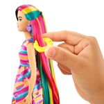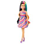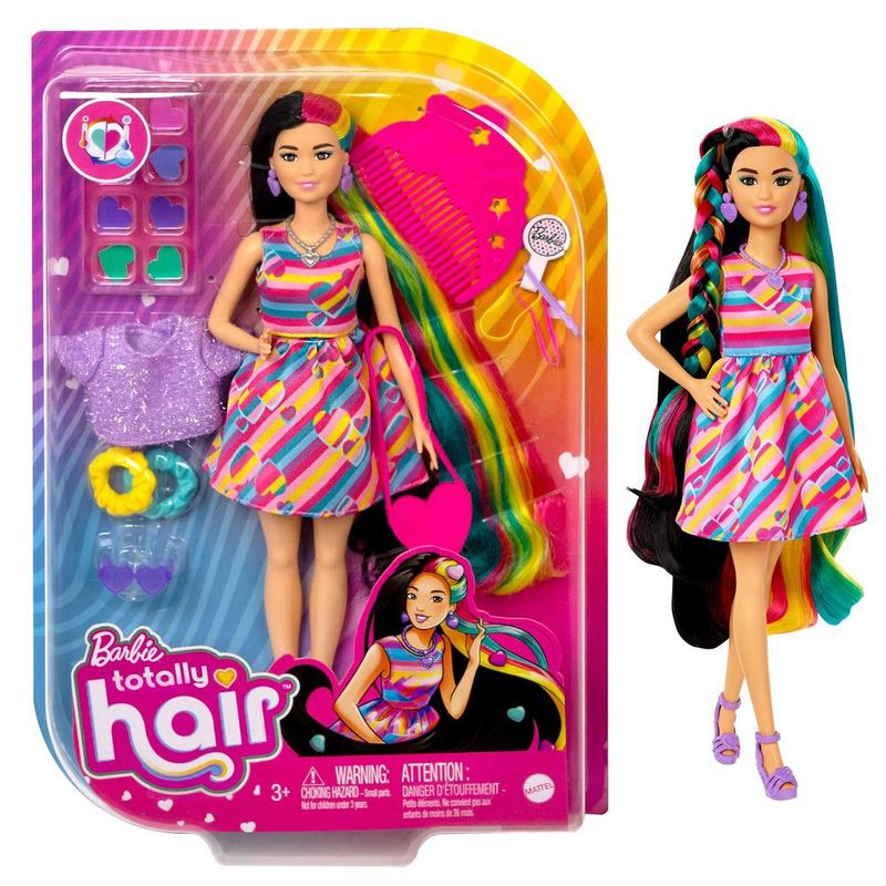 Inspirada na boneca Barbie mais vendida que fez ondas pela primeira vez há 30 anos, a boneca Barbie Totally Hair com tema de coração balança seu próprio penteado, textura de cabelo e aparência de moda! A boneca tem 8,5 polegadas de cabelo jogável extra-longo e vem com mais de 15 peças adicionais, incluindo 8 grampos de cabelo de mudança de cor, acessórios de estilo e uma moda extra. A boneca Barbie tem um formato de corpo pequeno e vem com cabelos meio preto, meio rosa fantasia, azul e amarelo. Ela usa um vestido sem mangas colorido com uma estampa de coração allover. As crianças vão adorar criar penteados diferentes e as infinitas possibilidades de estilo! Boneca não pode ficar sozinha. Cores e decorações podem variar. Para crianças a partir de 3 anos.