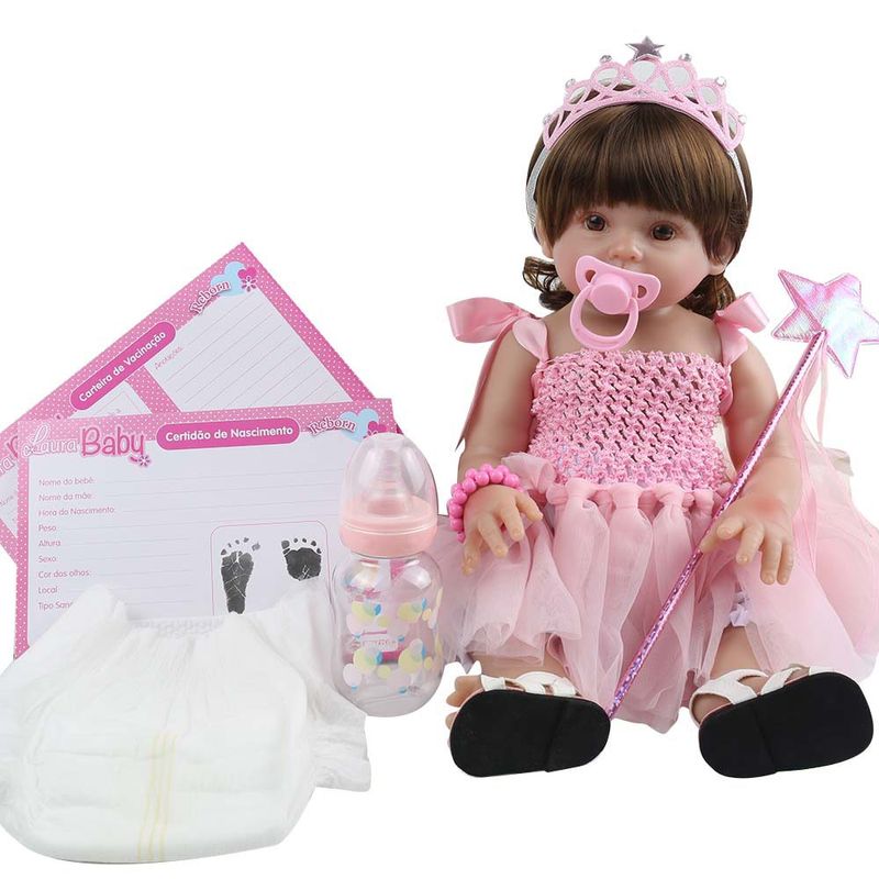 Bebês Reborn são bonecos cuja aparência se assemelha muito com os traços de bebês humanos. Geralmente são aplicados efeitos especiais para bochechas, manchinhas e dobrinhas dos pequenos, afinal de contas, a ideia é torna-lo mais parecido com a realidade possível. A boneca reborn Laura Baby com 45cm de altura, é super fofa e lembra muito uma criança. O brinquedo acompanha lindos acessórios para deixar a brincadeira ainda mais divertida. Aliás, quando se fala em boneca reborn, o público que mais identifica com o produto é o infantil, entretanto, como ele possui características próprias acabam por atrair adultos também, como é o caso de colecionadores, por exemplo. Inclui: ACOMPANHA: VESTIDO, SAPATOS, CHUPETA, MAMADEIRA, COROA, VARINHA E PULSEIRA ROSA, CERTIDÃO DE NASCIMENTO, CARTEIRINHA DE VACINAÇÃO.