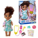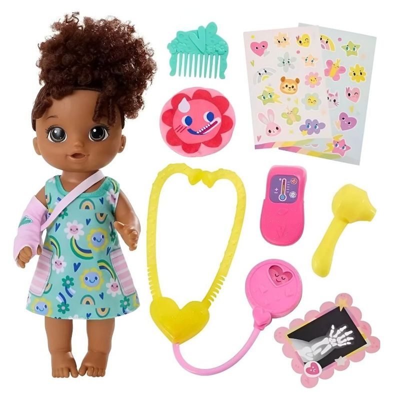 Conteúdo da embalagem: 1 Boneca Baby Alive de aproximadamente 30 cm, 1 Estetoscopio, 1 Pente, 1 Verificador de ouvido, 1 Termômetro, 1 Chapa de raio-x e 1 Gesso.