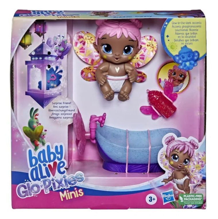 Muita diversão e surpresas com as bonecas Baby Alive GloPixies Minis! A boneca Bubble Sunny brilha no escuro e vem com 1 amiguinho surpresa. Quem será?