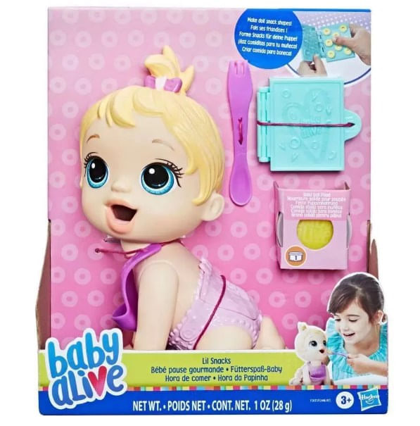 É hora do lanche! As crianças podem criar lanchinhos de mentirinha para a boneca com a comida reutilizável para a boneca e o molde incluídos. A boneca articulada de 20 cm pode ficar sentada ou fazer poses como se estivesse engatinhando. A fralda de plástico da boneca pode ser aberta para limpar a caquinha. Vem com babador removível, 1 pote de comida sólida para boneca, molde de lancheira e garfo/colher. A boneca Baby Alive Hora da papinha é um excelente presente!
