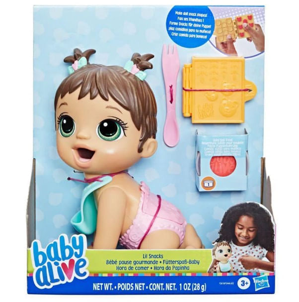 É hora do lanche! As crianças podem criar lanchinhos de mentirinha para a boneca com a comida reutilizável para a boneca e o molde incluídos. A boneca articulada de 20 cm pode ficar sentada ou fazer poses como se estivesse engatinhando. A fralda de plástico da boneca pode ser aberta para limpar a caquinha. Vem com babador removível, 1 pote de comida sólida para boneca, molde de lancheira e garfo/colher. A boneca Baby Alive Hora da papinha é um excelente presente!