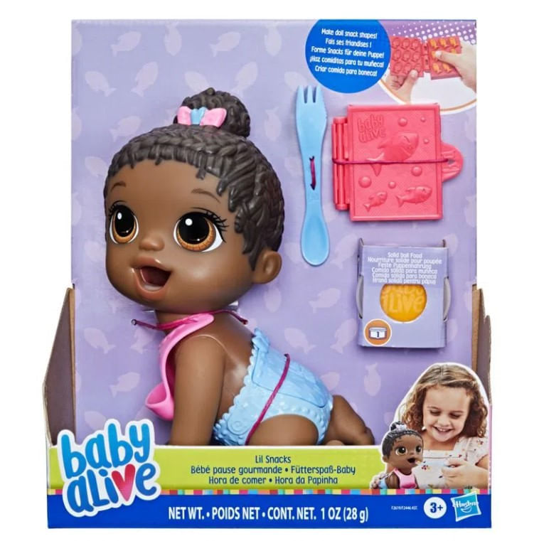 É hora do lanche! As crianças podem criar lanchinhos de mentirinha para a boneca com a comida reutilizável para a boneca e o molde incluídos. A boneca articulada de 20 cm pode ficar sentada ou fazer poses como se estivesse engatinhando. A fralda de plástico da boneca pode ser aberta para limpar a caquinha. Vem com babador removível, 1 pote de comida sólida para boneca, molde de lancheira e garfo/colher. A boneca Baby Alive Hora da papinha é um excelente presente!