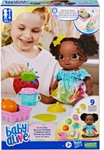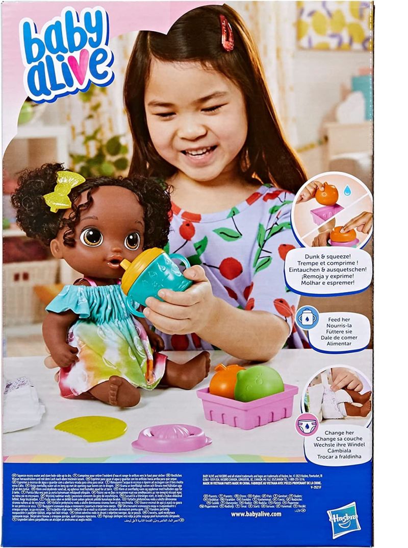 Esta boneca Baby Alive para crianças a partir dos 3 anos vem com roupa inspirada em fruta, esta boneca inclui pente e presilha. Vem com roupa inspirada em fruta.
