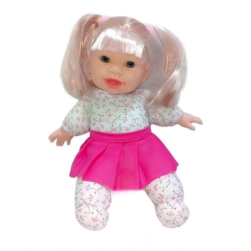 Ela vem vestida com roupinha estampada e saia rosa, transmitindo ainda mais fofura e estilo. Ideal para estimular a imaginação, o cuidado e a criatividade das crianças durante as brincadeiras de faz de conta.