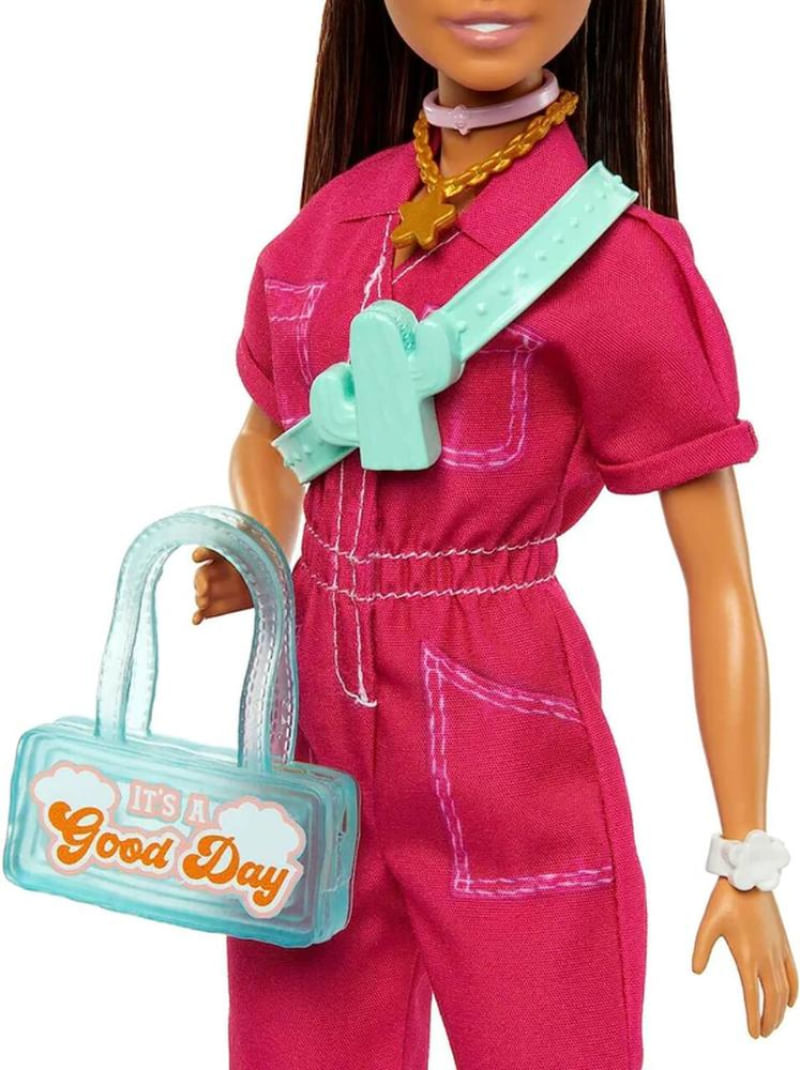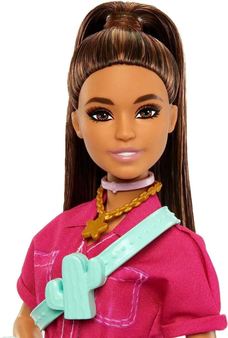 A boneca Barbie usa um macacão rosa vibrante com botas. Seu cabelo castanho liso está preso em um pônei alto!