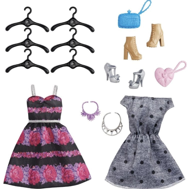 Conteúdo da Embalagem: 1 Armário portátil, Boneca Barbie vestindo roupas e sapatos da moda, 2 Vestidos, 2 Colares, 2 Bolsas, 2 Pares de sapatos adicionais e 6 Cabides