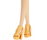 Saltos plataforma laranja e óculos rosa completam o look e dão charme. Seu cabelo loiro é estilizado para um visual suave e moderno.