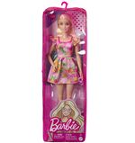 A boneca Barbie é o tipo de corpo original e usa um lindo vestido estampado de frutas com mangas e babados.