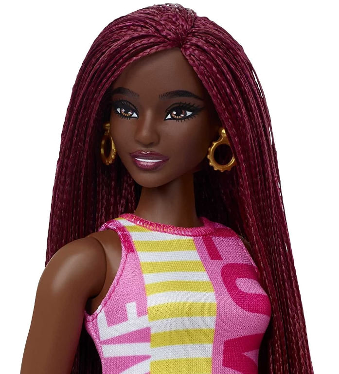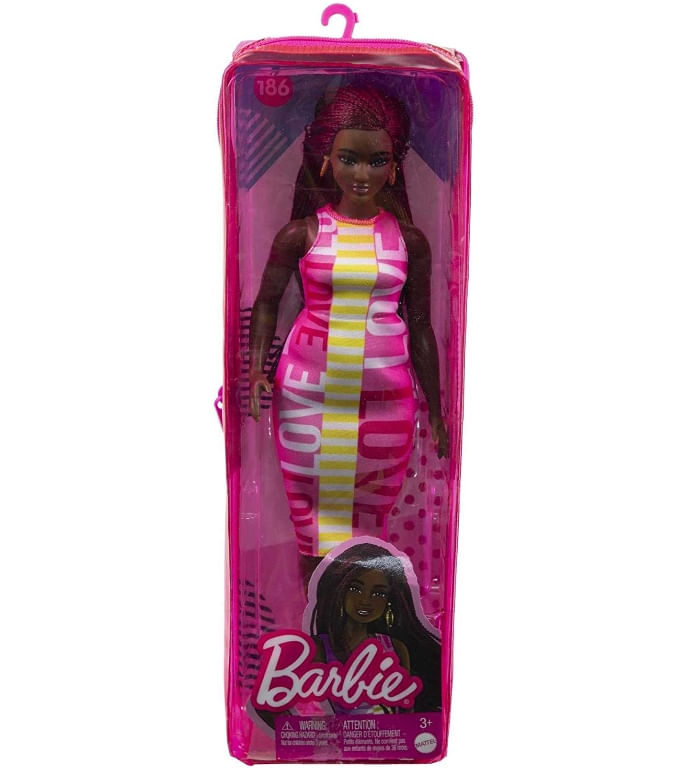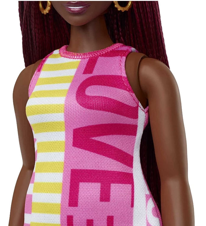 A boneca Barbie tem uma forma de corpo curvilínea e usa um vestido longo e sem mangas com estampas de "Love" e tênis branco para um visual moderno.