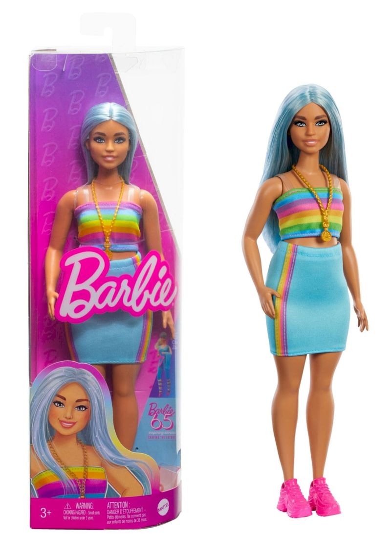 Boneca Barbie Fashionista #218 Fabricante: Mattel. Coleção: Fashionistas. Comemorando 65 anos de moda icônica e estilo próprio, as bonecas Barbie Fashionistas celebram a diversidade e oferecem infinitas possibilidades para contar histórias e explorar a moda. Com uma gama inclusiva de looks, as crianças podem ver como é divertido expressar personalidade através do estilo! E apresentando as tendências mais descoladas da atualidade, as bonecas Barbie são um presente ideal para crianças apaixonadas por moda em todos os lugares. Cada uma vendida separadamente, sujeita à disponibilidade. As bonecas não ficam em pé sozinhas. As cores e decorações podem variar. - A boneca Barbie comemora 65 anos de estilo exclusivo com versões modernas de looks icônicos e muitos toques exclusivos! - Inspirada em seu visual "Great Shape" de 1984, a boneca Barbie Fashionistas fica ótima usando um top tomara que caia arco-íris e uma saia esportiva azul-petróleo com listras combinando. - Tênis rosa e colar com pingente dourado dão um toque moderno ao visual colorido! - A boneca Barbie tem um corpo curvilíneo e seu longo cabelo azul é liso para um visual descolado e moderno! - Com infinitas possibilidades de estilo e narrativa, as bonecas Barbie são um ótimo Tamanho: 29 cm de comprimento.