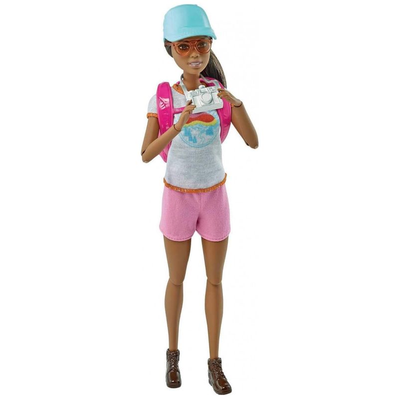 Inclui boneca Barbie vestindo camiseta, shorts, 1 par de sapatos, 1 boné e 1 par de óculos com 1 cachorrinho, 1 caixa de transporte para animais de estimação, 1 mapa, 1 garrafa de água, 1 frasco de protetor solar, 1 lancheira, 1 lanterna e 1 câmera. Boneca não pode ficar sozinha. Cores e decorações podem variar