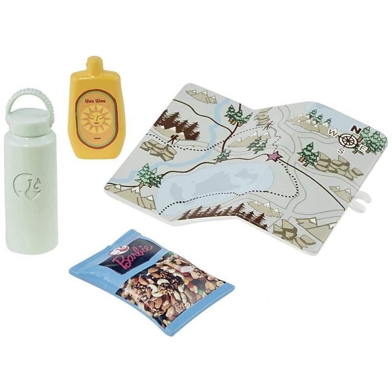 A boneca Barbie pode encontrar o local perfeito, tirar uma foto panorâmica e ficar segura com um mapa, garrafa de água, protetor solar, lanche, lanterna, boné, óculos, câmera e mochila.