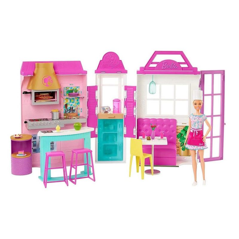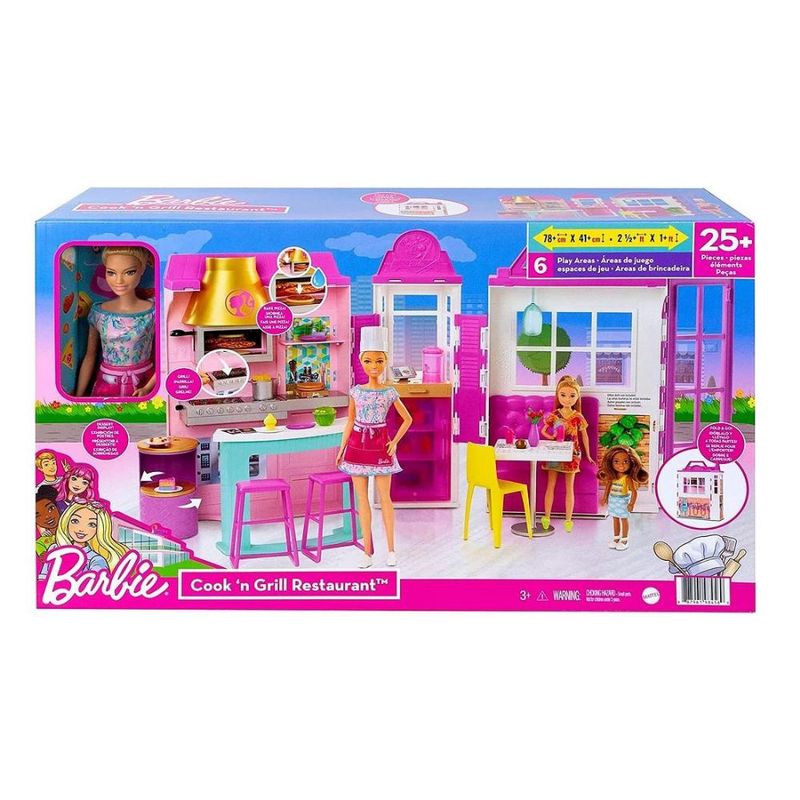 Conteúdo da embalagem: 1 playset restaurante dobrável, 1 boneca Barbie Chef e mais de 25 acessórios.