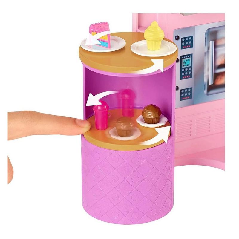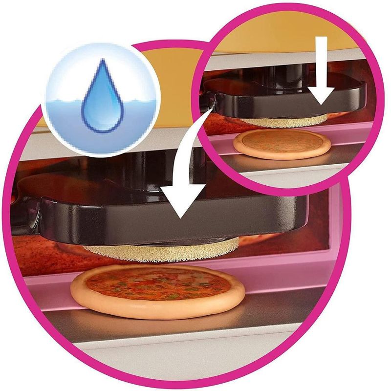 Em seguida, vá para a cozinha para virar hambúrgueres na grelha giratória, organizar doces na vitrine giratória de sobremesas, colocar uma pizza no forno e vê-la mudar de cor quando estiver "assada"!