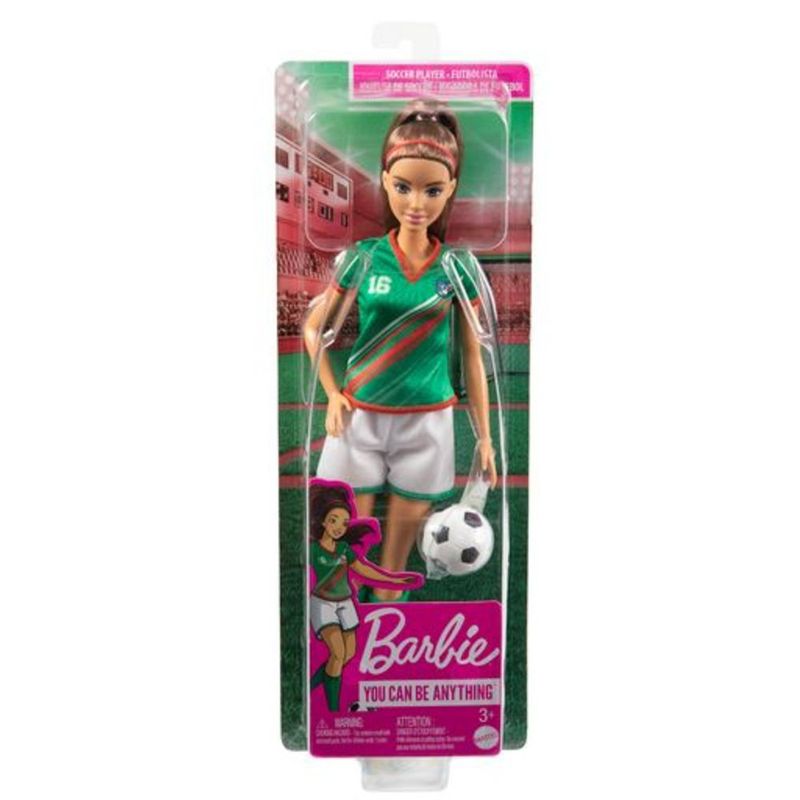 Prepare-se para celebrar um dos esportes favoritos das crianças com a Barbie Futebol! Inspirada em um esquema de cores mundialmente popular, a Barbie Futebol tem 29,2 cm, usa camisa número 16 verde com listras vermelhas e um emblema do time, além de calções brancos, chuteiras e meiões verdes. A Barbie Futebol também tem cabelos castanhos presos em um rabo de cavalo e vem com uma bola de futebol. A boneca não fica em pé sozinha. As cores e as decorações podem variar. A partir dos 3 anos.