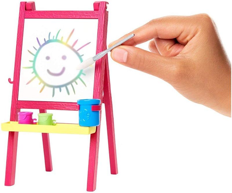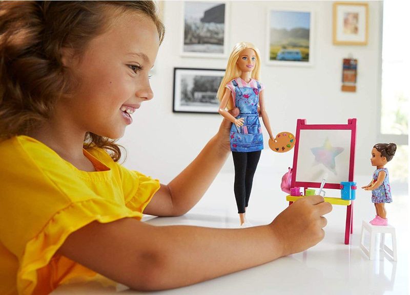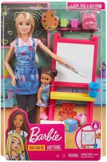 Explore um mundo de criatividade com o playset Professora de Artes. Inclui um ambiente de sala de aula de arte com a boneca Barbie Professora e sua adorável boneca estudante! Os professores de arte mostram aos alunos como se expressar através da arte e de toda a inspiração ao seu redor! Este playset apresenta um cavalete com prateleira para pintura com uma divertida surpresa de mudança de cor: mergulhe o pincel (incluído) em água e pinte a superfície branca e a pintura aparecerá magicamente! Barbie usa legging preta, camiseta, avental jeans e tênis branco. Boneca estudante usa um adorável vestido e carrega uma mochila. Os itens de brincar incluem: um cavalete com superfície de pintura, "recipientes" de tinta e água, paleta, pincel e escadinha. As crianças vão adorar as infinitas possibilidades de expressão criativa e diversão de contar histórias!
