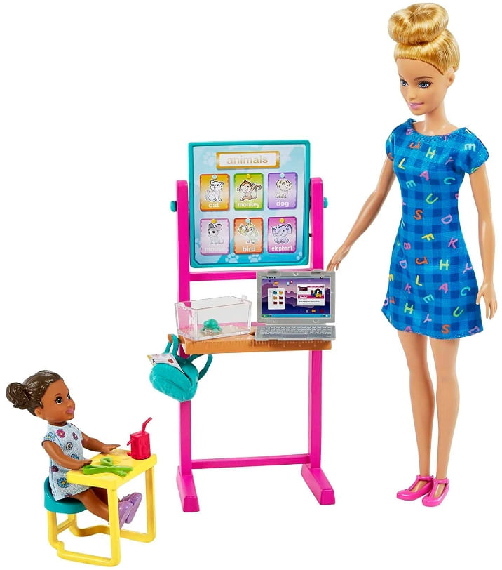 A boneca Barbie professora tem um laptop para que ela também possa ajudar seus alunos a aprender virtualmente! Existe até uma tartaruga de estimação em sala de aula que vem em um recipiente transparente e aberto.
