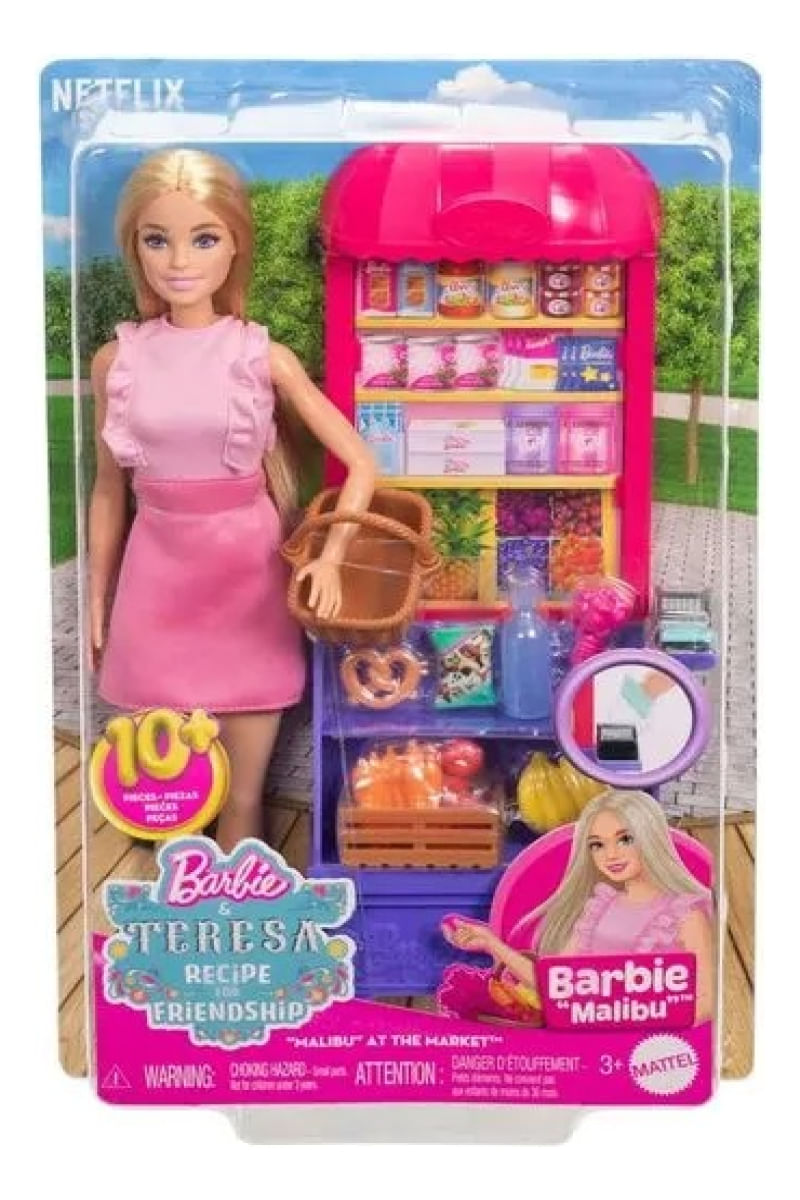 Barbie Receita da Amizade Teresa Supermercado - MattelA Barbie Receita da Amizade Teresa Supermercado proporcionam uma experiência única inspirada no filme Barbie e Teresa: Receita de Amizade. Com esse conjunto temático de comida, as crianças têm a liberdade de criar o cardápio ideal. A barraca do mercado possui um design vibrante com prateleiras para exibir alimentos e bebidas, convidando os pequenos a explorarem a imaginação.Diferenciais:11 acessórios temáticos, como uma cesta de compras e um scanner de cartões, que tornam a brincadeira ainda mais realista.A boneca Barbie "Malibu" vem com um look rosa e tênis, pronta para realizar suas compras.Indicado para crianças a partir de 3 anos, possibilitando a recriação de cenas do filme ou inventar novas aventuras culinárias.A boneca não consegue se manter em pé sozinha, estimulando as crianças a explorarem diferentes posições e interações.Mais sobre o Produto:O Barbie Receita da Amizade Teresa Supermercado - Mattel é ideal para estimular a criatividade, o desenvolvimento cognitivo e habilidades motoras das crianças. Além disso, promove a interação social em brincadeiras compartilhadas. Possui um design atrativo que proporciona uma experiência envolvente e divertida para os pequenos.Dicas de Uso:Incentive as crianças a explorarem cada detalhe do mercado, desde a escolha dos produtos até o momento do pagamento no caixa. Estimule a criatividade ao criar diferentes histórias e situações envolvendo a boneca Barbie e seus acessórios. Aproveite para ensinar sobre a importância da alimentação saudável e a prática de compras responsáveis.Ficha Técnica:Marca: Mattel;Nome do produto: Barbie Receita da Amizade Teresa Supermercado;Idade recomendada: A partir de 3 anos;Selo Inmetro: 005388/2021;Contém: 1 boneca Barbie "Malibu" fashion usando vestido e sapatos, barraca de mercado, cesta, engradado, buquê de flores, garrafa de água, scanner de cartão, cartão e 5 peças de comidaCodigo interno 5454237251 -017