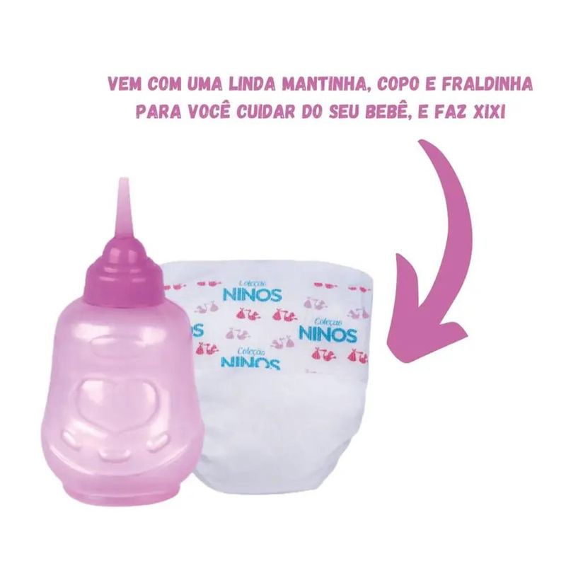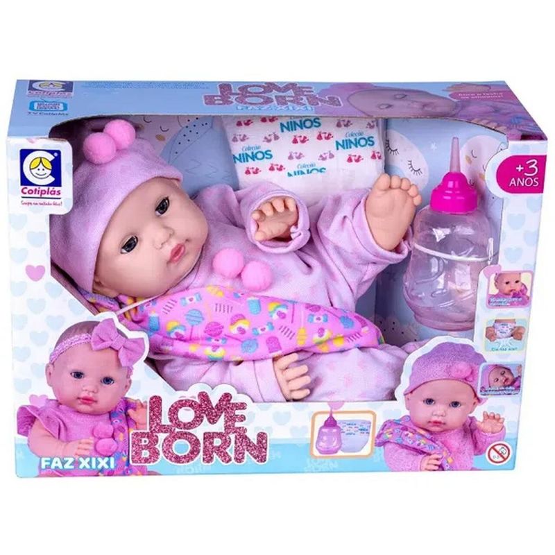 -Boneca Love Born Menina com touca rosa que faz xixi, proporcionando uma experiência realista de cuidados com bebê -Love Born é uma coleção encantadora de bonecas macias e com suave cheirinho de bebê, perfeitas para todos os momentos. -Vem com uma linda mantinha, copo e fraldinha para você cuidar do seu bebê, e faz xixi. -Ideal para brincadeiras de faz de conta, estimulando o cuidado e a responsabilidade nas crianças -(Cores da roupa da boneca podem variam conforme lote, foto meramente ilustrativa). Características: Marca - Cotiplás Cód. 2608 Conteúdo - 1 Boneca Bebezinho faz xixi,1 mamadeirac,1 fraldinha e uma mantinha. Tamanho da boneca: aprox. 35,5cm Material / Composição: Vinil