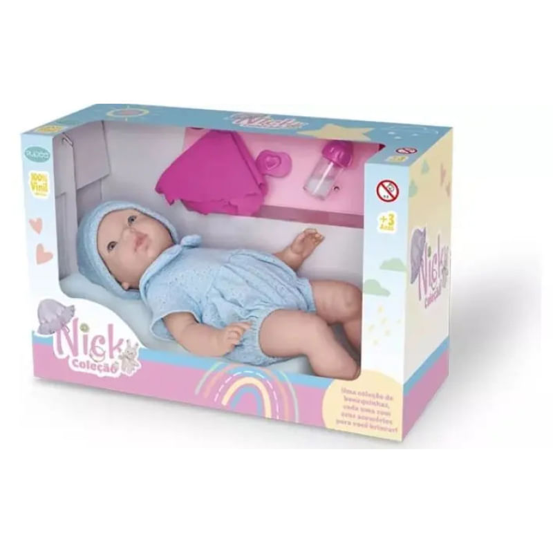 Sua pequena vai amar e se divertir muito com a boneca Nick. uma bonequinha fofa que vem com uma mantinha, bico e mamadeira, além de um vestidinho cheio de charme e um paninho de tiara