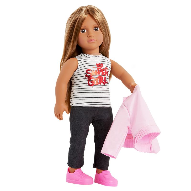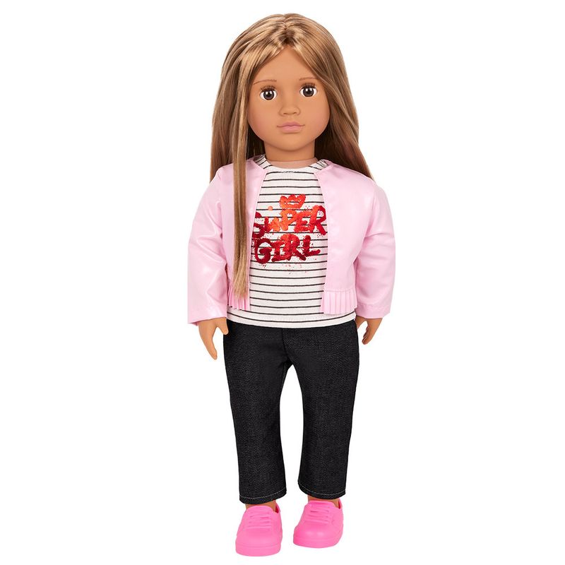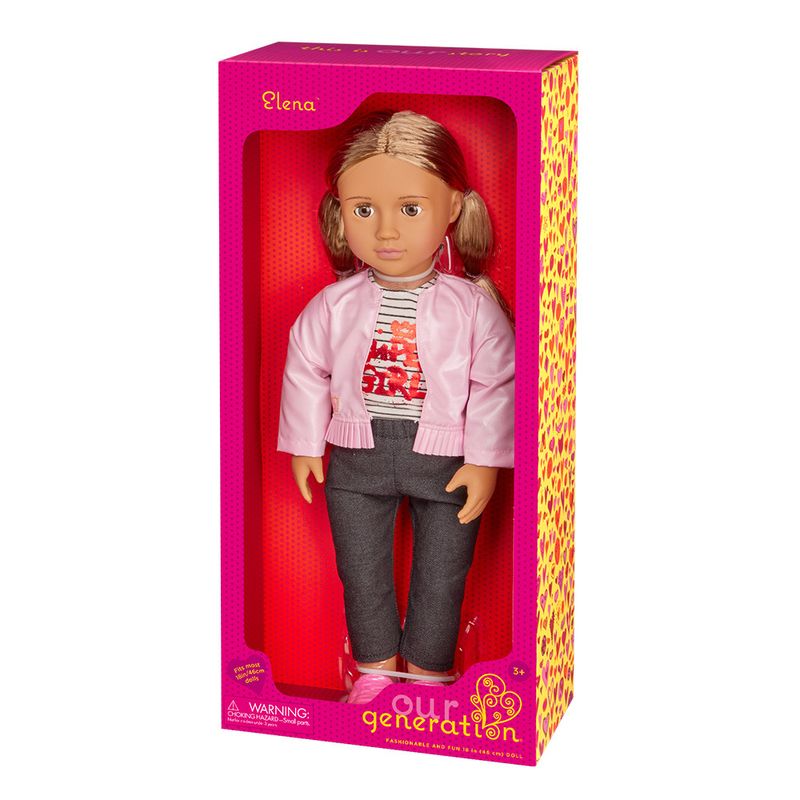 Conheça as encantadoras Bonecas Our Generation, uma opção perfeita para brincadeiras criativas e imaginativas. Com aproximadamente 46cm de altura, essas bonecas cativantes apresentam uma diversidade de estilos e personalidades. Our Generation vai além de ser apenas uma boneca. É um mundo de possibilidades para crianças de todos os estilos e gostos. Com nossas bonecas, conjuntos de roupas e acessórios incríveis, incentivamos a imaginação e o desenvolvimento de histórias únicas. Our Generation: essa é a nossa história, e essa é a nossa turma! Amizade e moda se combinam perfeitamente com Elena! Esta boneca Our Generation oferece diversão com um corpo macio e características realistas, encantando os fãs de bonecas. Seus olhos castanhos escuros e cabelos loiros escuros são perfeitos para criar penteados incríveis! Elena chega vestida com uma blusa "Super Girl", calças jeans e um lindo casaco rosa para inspirar aventuras ao ar livre. Com fechos fáceis, trocar de roupa é uma brincadeira. Presenteie com as bonecas Our Generation e estimule a imaginação das crianças para criar histórias únicas! Itens Inclusos: - Boneca de 46cm - 1 jaqueta rosa - 1 calça - 1 camiseta - 1 par de sapatos