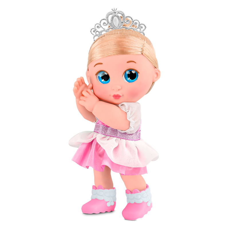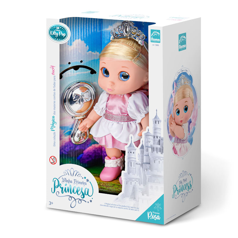 crianças deem vida às suas histórias favoritas. Seus lindos olhos azuis, que brilham como estrelas, e seus cabelos loiros deslumbrantes, são apenas o começo do seu charme. Kilty Pop vem vestida com um encantador vestido e botinhas que completam seu look de princesa. Para adicionar um toque extra de magia, ela acompanha uma tiara em formato de coroa e um espelho prateado brilhante, perfeitos para momentos de faz de conta.