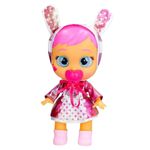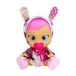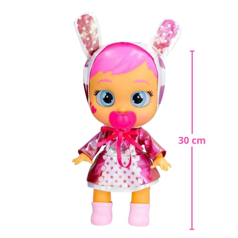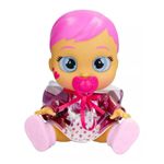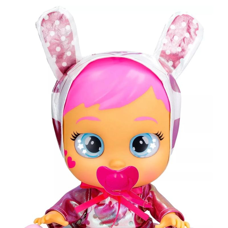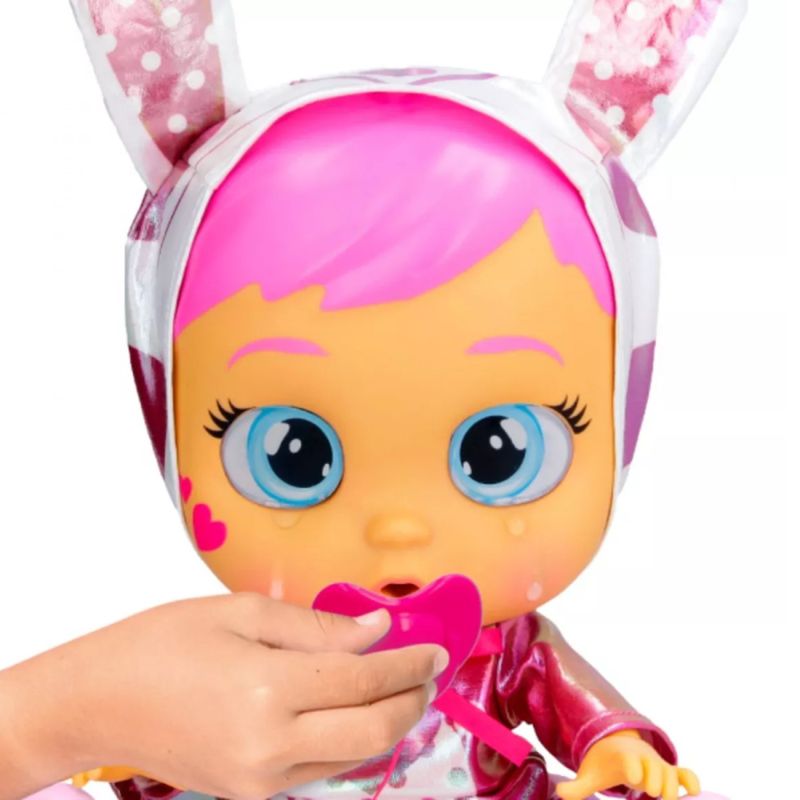 Quando sua chupeta é retirada, ela começa a chorar lágrimas de verdade e, pela primeira vez, seus olhos se iluminam! Para de chorar apenas quando sua chupeta é colocada de volta, fazendo sons que simulam o choro de um bebê de verdade.