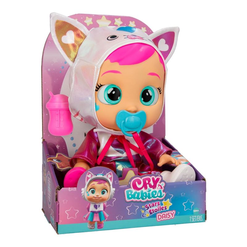 Cuide da Daisy como se fosse um bebê de verdade. Ofereça a ela uma chupeta ou uma mamadeira para que ela não chore. Quando você tira a chupeta dela, a mágica acontece: Daisy chora lágrimas de verdade e seus olhos se enchem de estrelas, brilhando intensamente como o céu noturno!