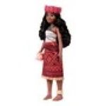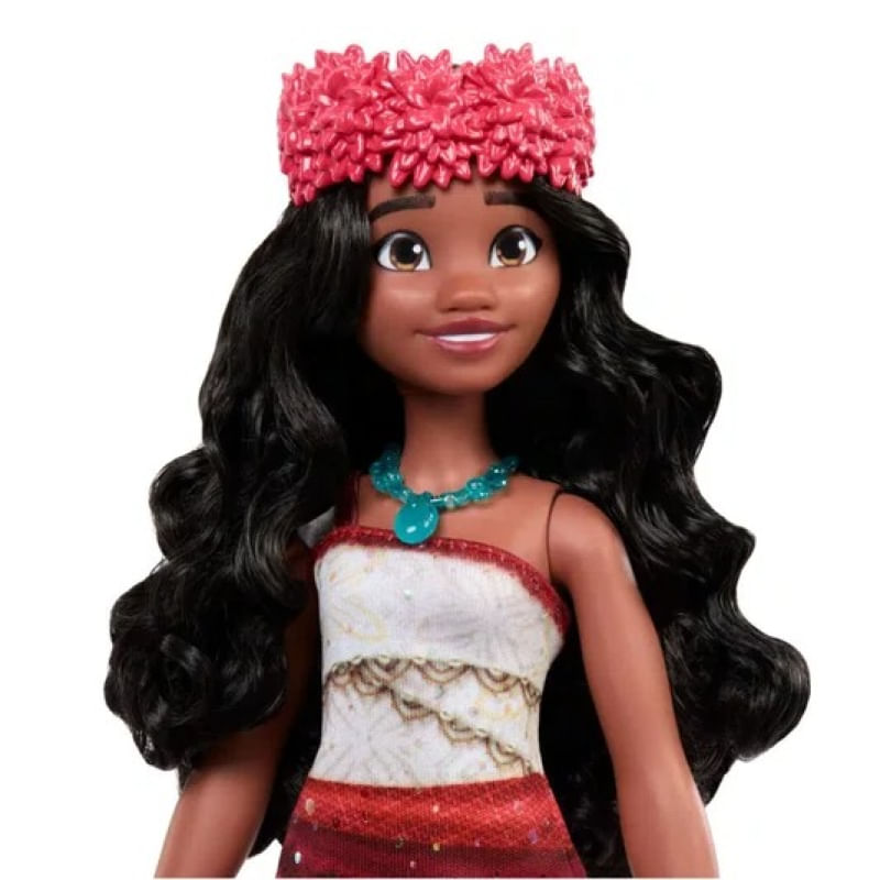 Moana veste seu traje de aventura fiel ao filme, exibindo seus lindos cabelos ondulados, e vem com quatro acessórios: uma coroa de flores, um remo, uma concha e um colar.