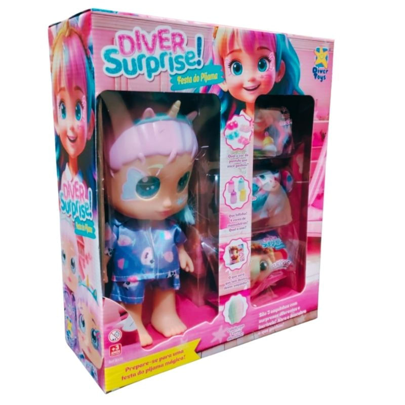 A Boneca Diver Surprise – Festa do Pijama está pronta para uma noite de muita diversão e histórias antes de dormir! Com um visual encantador, ela usa um pijama super fofo e moderno, e vem com 3 saquinhos surpresa que tornam a brincadeira ainda mais divertida. Pode ser uma pantufa, uma máscara de dormir ou acessórios incríveis para deixar a noite do pijama completa! Com cabelos coloridos e longos, perfeitos para pentear, essa boneca convida a criança a usar a imaginação e criar momentos de carinho, cuidado e amizade. Características: - Conteúdo da Embalagem: 1 boneca e 3 saquinhos surpresa- Marca: Divertoys- Modelo: 8325- Dimensões da Embalagem: 30cm, 32cm, 12cm- Código de Barras: 7898639383259- Certificação: INMETRO Recomendado para maiores de 3 anos. Importante: - Nossos produtos encontram-se em estoque- Todos os produtos são lacrados- Produtos acompanham nota-fiscal e garantia