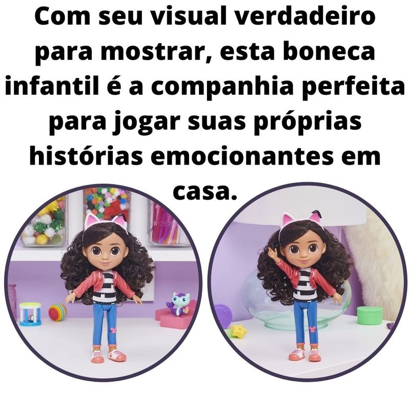 - Saia com gabby da Gabby's Dollhouse com a nova boneca Gabby Girl! Com detalhes realistas da cabeça aos dedos dos dois, esta boneca de 8 polegadas dá vida a Gabby. Gabby Girl usa sua roupa clássica do show, incluindo tênis, jeans com um patch de gatinho, um top de tecido e sua assinatura de orelhas de gato na cabeça! Sua faixa de orelhas de gato é removível, e ela ainda tem cabelo macio e encaracolado que você pode estilizar. Com seu visual verdadeiro para mostrar, esta boneca infantil é a companhia perfeita para jogar suas próprias histórias emocionantes em casa. Pose os braços e pernas de Gabby e use sua imaginação para recriar suas cenas favoritas do show. A boneca Gabby Girl é um grande presente para crianças e fãs do show. Junte-se à sua nova BFF Gabby para aventuras intermináveis com a boneca Gabby's Dollhouse Gabby Girl!