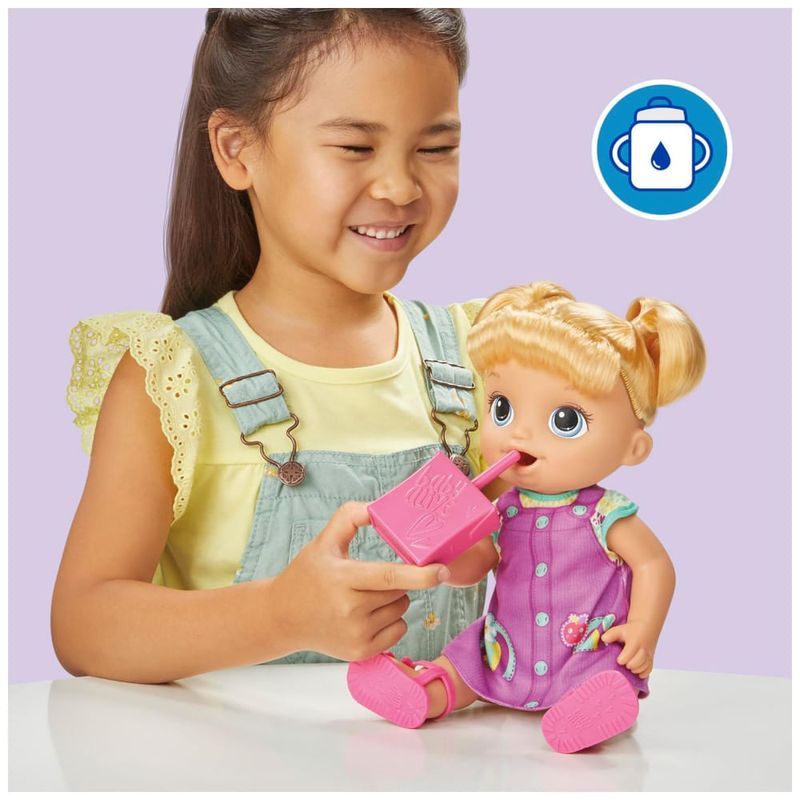 A boneca Baby Alive tem 30 cm de altura e possui pernas e braços articuláveis, tornando a fácil de levar para qualquer lugar. Ela até mesmo bebe de seu acessório de caixa de suco e molha sua fralda. Este conjunto de bonecas e brinquedos pré escolares é um ótimo presente para crianças de 3 anos ou mais, para feriados, aniversários ou volta às aulas.