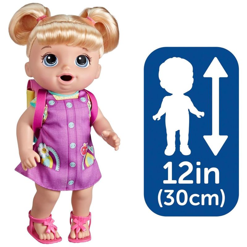 Prepare se para o primeiro dia de aula com a boneca Time for School Baby Ela vem com uma mochila completa com todos os acessórios necessários para se divertir, incluindo uma bebida e uma troca de fralda. Com roupas da moda, como um suéter adorável e sandálias removíveis, ela é perfeita para brincar de escola de faz de conta. Além disso, a boneca vem com 3 planilhas coloridas do tamanho de uma boneca que cabem em sua pasta ou mochila, além de adesivos para decorar.