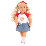 Our Generation - Boneca Jolene, tem 46 cm e ama pizza! Ela tem olhos verdes brilhantes que abrem e fecham, e seu longo cabelo loiro ondulado é divertido de escovar e pentear! Jolene adora se expressar através de roupas coloridas e designs divertidos. Ela está vestindo um top vermelho e branco com uma estampa de pizza com carinha feliz, uma saia estilo jeans, meias até o joelho e sapatos rosa e branco. Jolene também pode girar os braços e as pernas e você pode dar a ela penteados exclusivos com sua faixa vermelha brilhante para um toque de estilo pessoal!   Our Generation não se trata apenas de uma boneca, um lindo conjunto de roupas ou mesmo um kit de acessórios fantásticos. É sobre incentivar crianças de todos os estilos e gostos a criar suas próprias histórias, desenvolvendo um universo ilimitado de brincadeiras com bonecas e acessórios. Sua embalagem é feita de material reciclado, especialmente desenvolvida para uma geração mais ecológica que não aceitaria nada menos. Essa é a nossa história, e essa é a nossa turma!