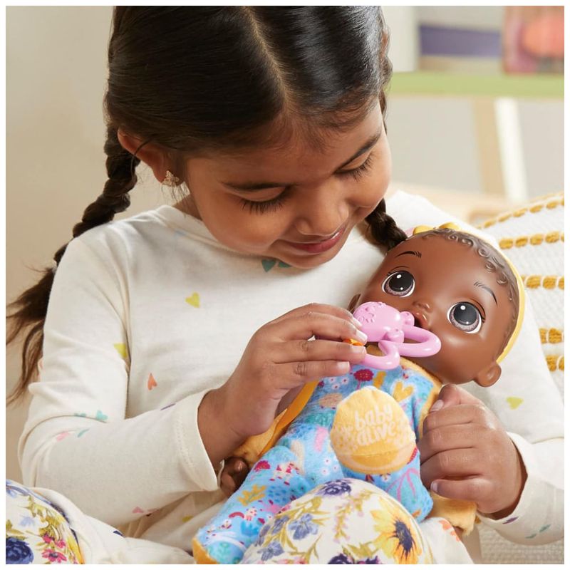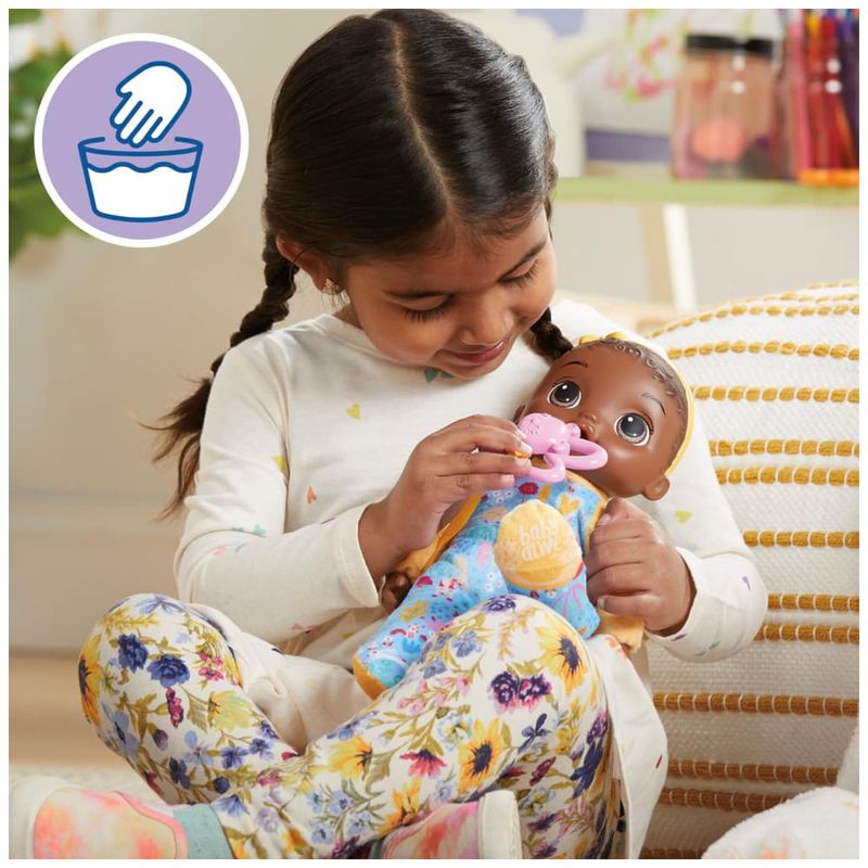 Além disso, ela pode ser posada como um bebê com o polegar na boca. Esta boneca é totalmente lavável na máquina, tornando a limpeza muito fácil. É um presente maravilhoso para bebês, chá de bebê, aniversários e feriados, com uma embalagem com tema de berço para presente. A Baby Alive e todas as propriedades relacionadas são marcas registradas da Hasbro.