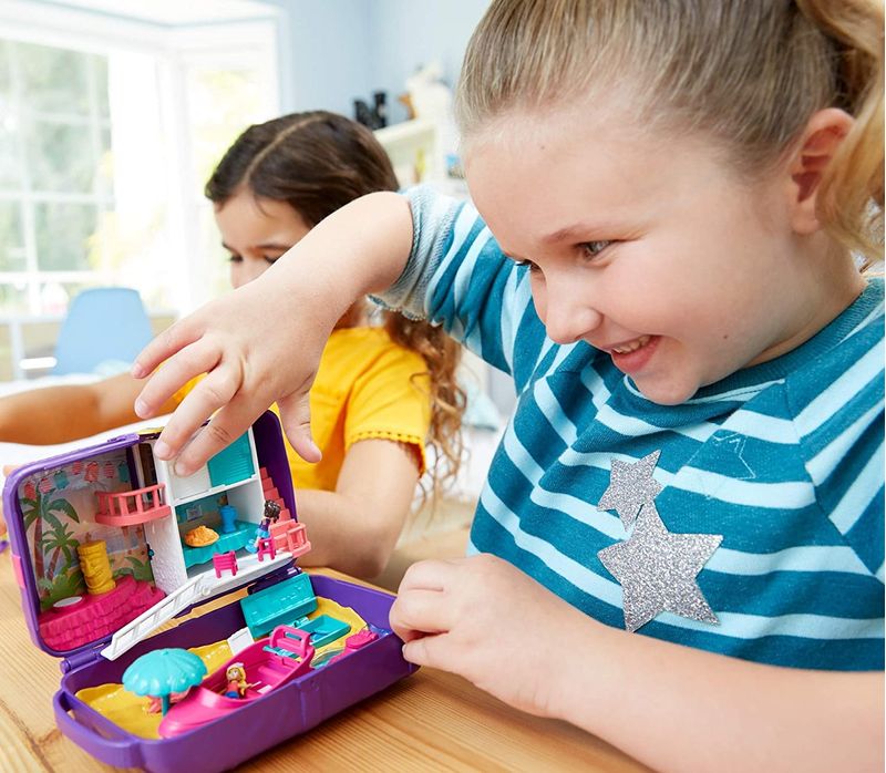 A Mochila Beach Vibes abre para revelar um mundo Polly com tema maior e é ótimo para levar para qualquer lugar, em qualquer lugar! A mochila Beach Vibes abre para revelar uma cena e áreas de areia e sol na praia para aproveitar a melhor praia! A mochila inclui revelações secretas adicionais, micro bonecos Polly e Shani, veículo para micro-velocidade, além de acessórios de praia e comida.