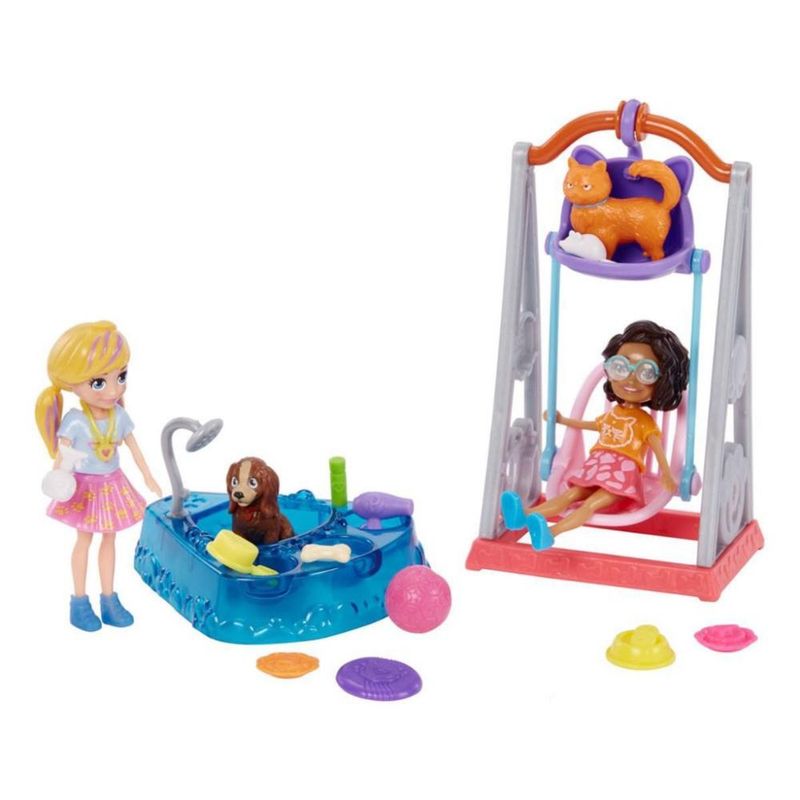 As bonecas Polly™ e Shani™ estão prontas para momentos divertidos de balançar e se molhar com seus animais de estimação! O conjunto 2 Amigas Hora De Brincar inclui um lindo balanço duplo rosa e roxo para que você possa se divertir com seus animais de estimação! A boneca Polly™ pode balançar seu cachorrinho, Peaches, e a boneca Shani™ pode balançar seu gatinho, Capitão Collywobbles, no balanço ao mesmo tempo! Há também uma banheira de água para que os bichinhos possam brincar, se refrescar e tomar banho. Quando terminar, as meninas podem "secar" seus animais de estimação. O conjunto inclui as bonecas Polly™ e Shani™, Peaches, Capitão Cobblywobbles, bola, tigela de comida, guloseimas, frisbee, brinquedo de rato, xampu, escova e secador.