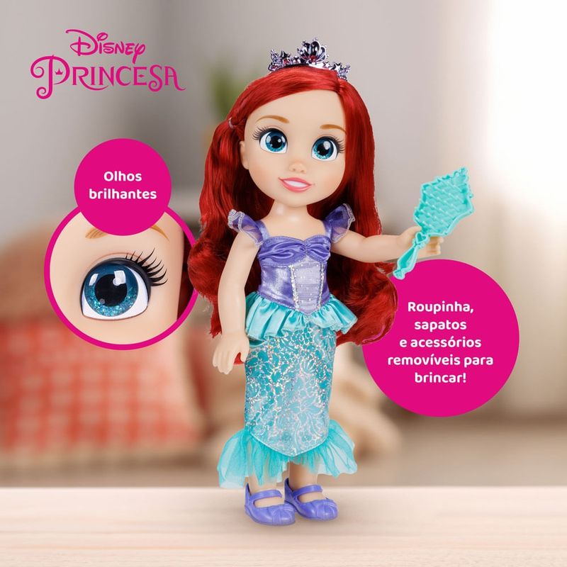 Vestida em seu icônico vestido de sereia com belos detalhes de glitter, Ariel está pronta para se juntar a você em qualquer brincadeira. Essa linda boneca possui olhos brilhantes de glitter, mede 38cm de altura e acompanha uma tiara e um lindo par de sapatos. Leve Ariel para onde você for e descubra lugares distantes juntas!