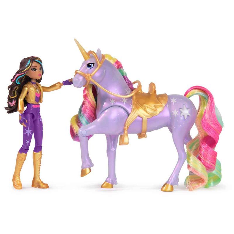 Experimente a magia da Academia Unicórnio com Sophia e o Unicórnio da Luz Wildstar! Inspirada no desenho animado da NETFLIX e na série de livros, esta dupla celebra o vínculo único entre o cavaleiro e unicórnio. Com seus detalhes fiéis ao desenho e crina e cauda suaves de arco-íris, e efeitos de luz reais no Wildstar, este conjunto irá permitir uma brincadeira imaginativa e encantadora. Com 7 pontos de articulação, coloque Sophia para montar no Wildstar e pressione o botão de marcação de estrela na lateral do unicórnio para ativar as luzes, enquanto você recria suas cenas favoritas. Wildstar pisa seu casco, usando sua Magia da Luz para projetar um padrão de arco-íris, assim como no desenho! Sophia permanece firmemente no lugar no Wildstar com os acessórios removíveis de rédea e sela.