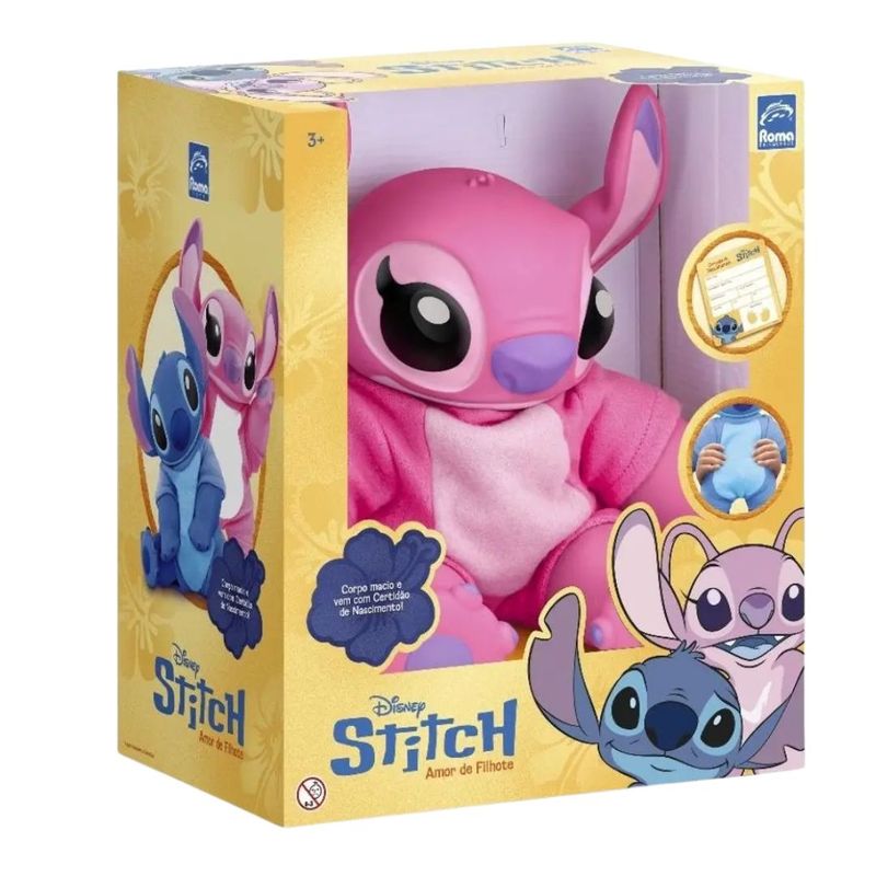 A parceria Roma e Disney traz mais uma novidade, agora, a Angel parceira do famoso Stitch para a linha Amor de Filhote. Super fofinha e linda, Angel vem com pijaminha para brincar tanto de dia quanto de noite, seu corpo macio, com pernas, braços e cabeça em vinil. Vem com certidão de Nascimento para você registrar essa fofura de bebê!