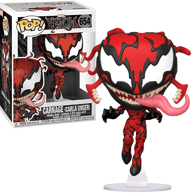 O boneco Funko Pop Carnage Carla Unger tem 9,5 cm de altura.