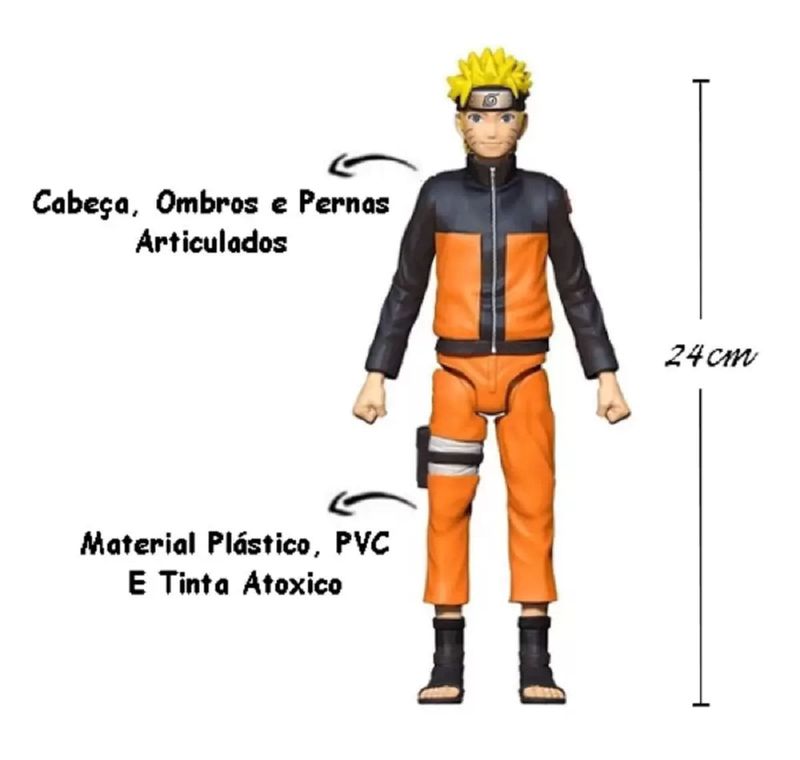 Boneco Naruto Uzumaki com 24 cm de altura, articulações nos braços e pernas .