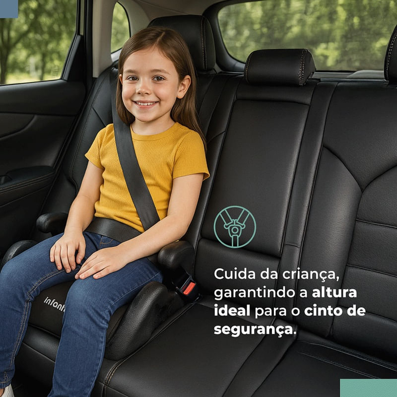Cuida da criança, garantindo a altura ideal para o cinto de segurança.
